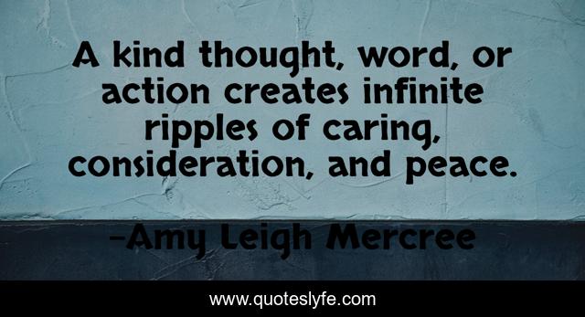 This page presents the quote "A kind thought, word, or action creates infinite ripples of caring, consideration, and peace.". Author of this quote is Amy Leigh Mercree. This quote is about caring, kindness, quotes-de-la-vida, amy-leigh-mercree, quote-of-the-day, quotes-tumblr, inspirational, quote-about-life, infinite,.