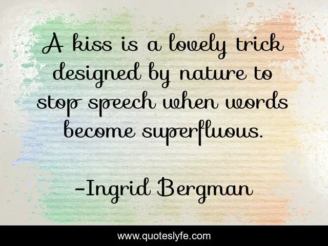 This page presents the quote "A kiss is a lovely trick designed by nature to stop speech when words become superfluous.". Author of this quote is Ingrid Bergman. This quote is about love, kiss, nature, trick, words, affection,.