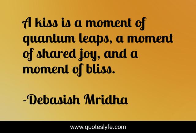 This page presents the quote "A kiss is a moment of quantum leaps, a moment of shared joy, and a moment of bliss.". Author of this quote is Debasish Mridha. This quote is about joy, philosophy, debasish-mridha, moment-of-bliss, shared-joy, quotes, a-kiss, inspirational, enthusiasm,.