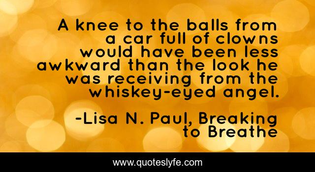 This page presents the quote "A knee to the balls from a car full of clowns would have been less awkward than the look he was receiving from the whiskey-eyed angel.". Author of this quote is Lisa N. Paul, Breaking to Breathe. .