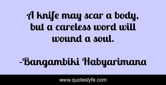This page presents the quote "A knife may scar a body, but a careless word will wound a soul.". Author of this quote is Bangambiki Habyarimana. This quote is about wounds-to-the-heart, proverbs, words-have-power,.