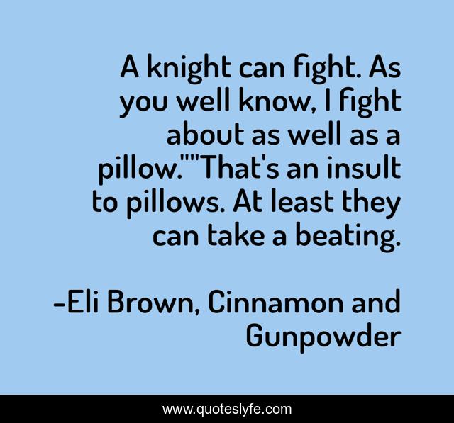 This page presents the quote "A knight can fight. As you well know, I fight about as well as a pillow.""That's an insult to pillows. At least they can take a beating.". Author of this quote is Eli Brown, Cinnamon and Gunpowder. This quote is about weaknesses, humor, fighting,.