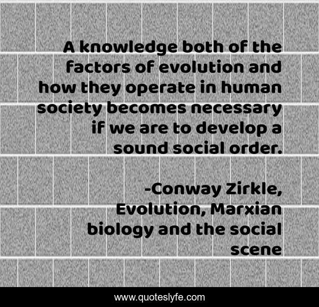 This page presents the quote "A knowledge both of the factors of evolution and how they operate in human society becomes necessary if we are to develop a sound social order.". Author of this quote is Conway Zirkle, Evolution, Marxian biology and the social scene. This quote is about society, evolution, sociology,.