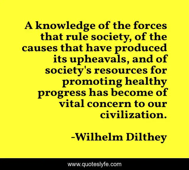 This page presents the quote "A knowledge of the forces that rule society, of the causes that have produced its upheavals, and of society's resources for promoting healthy progress has become of vital concern to our civilization.". Author of this quote is Wilhelm Dilthey. This quote is about healthy, progress, society,.