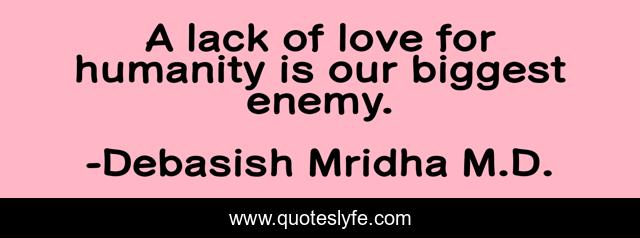 This page presents the quote "A lack of love for humanity is our biggest enemy.". Author of this quote is Debasish Mridha M.D.. This quote is about love, philosophy, debasish-mridha-m-d, quotes, inspirational, enthusiasm, humanity, affection,.
