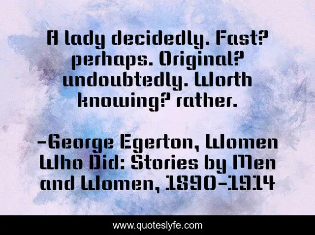 "George Egerton, Women Who Did: Stories by Men and Women, 1890-1914 Quotes." Quoteslyfe.com, 2025. Fri. 05 Dec. 2025. <https://www.quoteslyfe.com/quote/A-lady-decidedly-Fast-perhaps-Original-undoubtedly-258221>.
