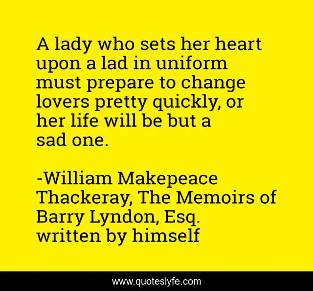 This page presents the quote "A lady who sets her heart upon a lad in uniform must prepare to change lovers pretty quickly, or her life will be but a sad one.". Author of this quote is William Makepeace Thackeray, The Memoirs of Barry Lyndon, Esq. written by himself. This quote is about soldiers, love, war, affection,.