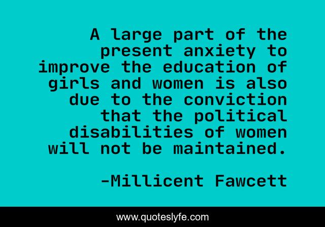 This page presents the quote "A large part of the present anxiety to improve the education of girls and women is also due to the conviction that the political disabilities of women will not be maintained.". Author of this quote is Millicent Fawcett. This quote is about anxiety, education,.