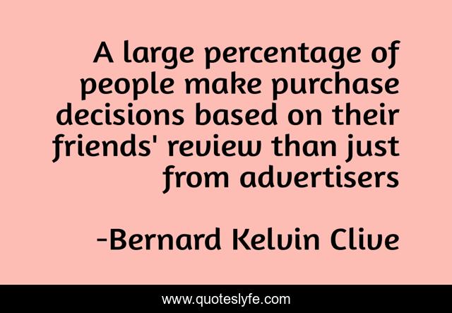 This page presents the quote "A large percentage of people make purchase decisions based on their friends' review than just from ‪‎advertisers". Author of this quote is Bernard Kelvin Clive. This quote is about brands, advertisers, social-media, marketing,.