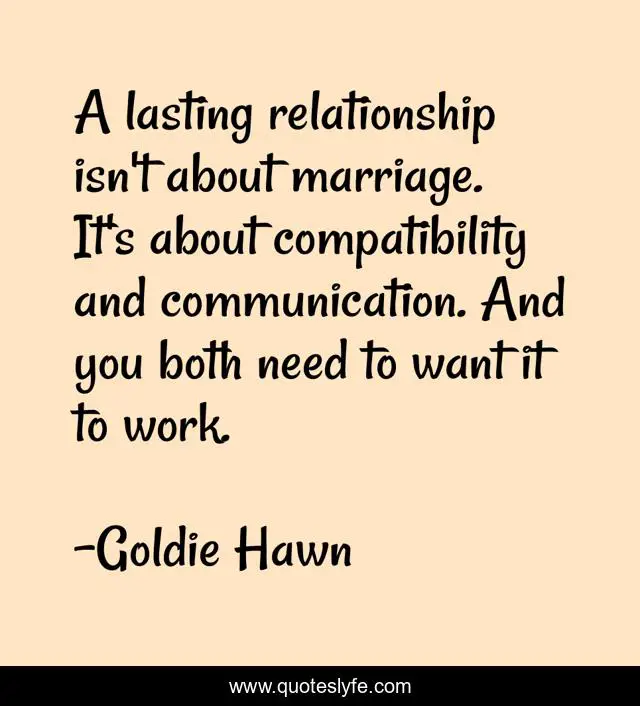 This page presents the quote "A lasting relationship isn't about marriage. It's about compatibility and communication. And you both need to want it to work.". Author of this quote is Goldie Hawn. This quote is about work, marriage, relationship,.