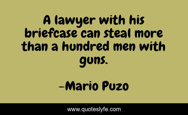 This page presents the quote "A lawyer with his briefcase can steal more than a hundred men with guns.". Author of this quote is Mario Puzo. This quote is about guns, lawyer,.
