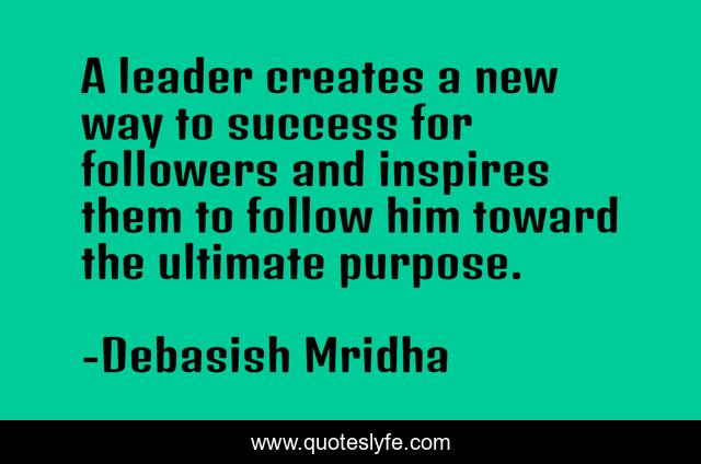 This page presents the quote "A leader creates a new way to success for followers and inspires them to follow him toward the ultimate purpose.". Author of this quote is Debasish Mridha. This quote is about life, love, inspire, success, inspirational, intelligence, create, philosophy, knowledge,.