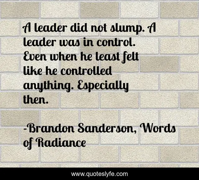 This page presents the quote "A leader did not slump. A leader was in control. Even when he least felt like he controlled anything. Especially then.". Author of this quote is Brandon Sanderson, Words of Radiance. This quote is about control, leadership, dalinar-kholin,.