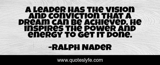 This page presents the quote "A leader has the vision and conviction that a dream can be achieved. He inspires the power and energy to get it done.". Author of this quote is Ralph Nader. This quote is about dream, leader, vision,.