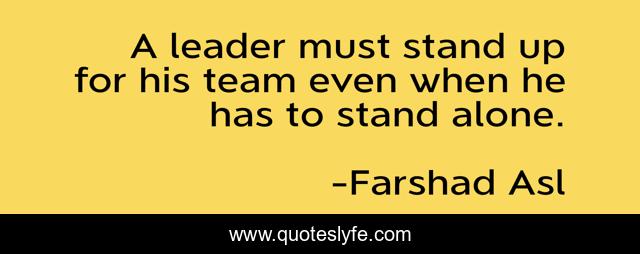 This page presents the quote "A leader must stand up for his team even when he has to stand alone.". Author of this quote is Farshad Asl. This quote is about stand-up-alone, leadership, leader, stand-up, team,.