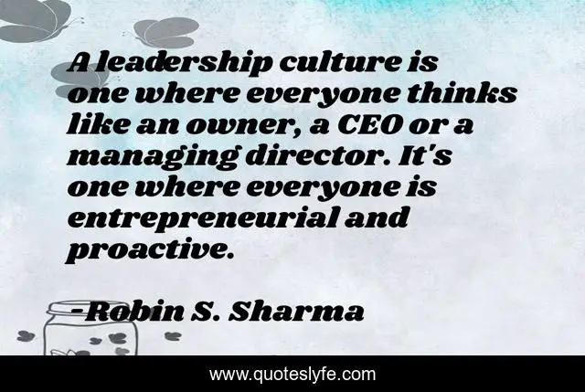 This page presents the quote "A leadership culture is one where everyone thinks like an owner, a CEO or a managing director. It's one where everyone is entrepreneurial and proactive.". Author of this quote is Robin S. Sharma. This quote is about director, culture, proactive,.