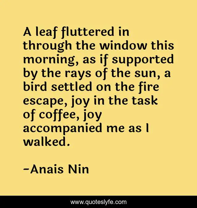 This page presents the quote "A leaf fluttered in through the window this morning, as if supported by the rays of the sun, a bird settled on the fire escape, joy in the task of coffee, joy accompanied me as I walked.". Author of this quote is Anais Nin. This quote is about sun, coffee, joy,.