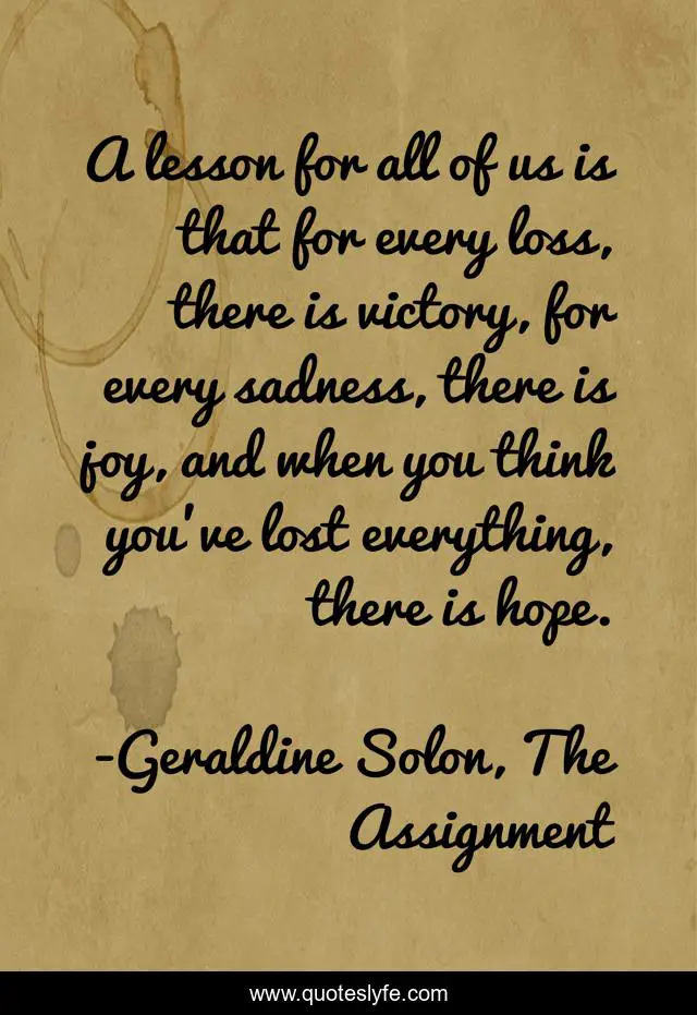 This page presents the quote "A lesson for all of us is that for every loss, there is victory, for every sadness, there is joy, and when you think you’ve lost everything, there is hope.". Author of this quote is Geraldine Solon, The Assignment. This quote is about loss, pain, sadness, inspirational, enthusiasm, hope,.