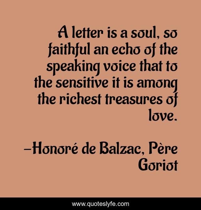This page presents the quote "A letter is a soul, so faithful an echo of the speaking voice that to the sensitive it is among the richest treasures of love.". Author of this quote is Honoré de Balzac, Père Goriot. This quote is about romance, love, letter, affection, writing,.