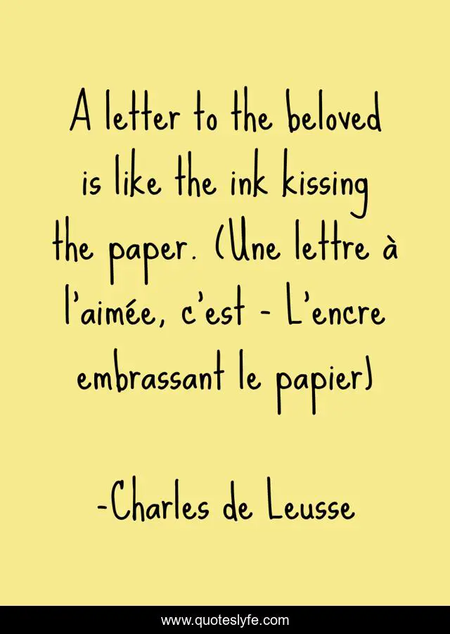This page presents the quote "A letter to the beloved is like the ink kissing the paper. (Une lettre à l'aimée, c'est - L'encre embrassant le papier)". Author of this quote is Charles de Leusse. This quote is about lettre, bise, kiss, aimée, paper, encre, ink, letter, papier,.