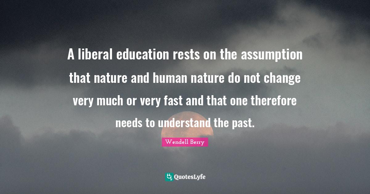 This page presents the quote "A liberal education rests on the assumption that nature and human nature do not change very much or very fast and that one therefore needs to understand the past.". Author of this quote is Wendell Berry. This quote is about assumption, liberal education, human nature, past, needs, nature, change,.