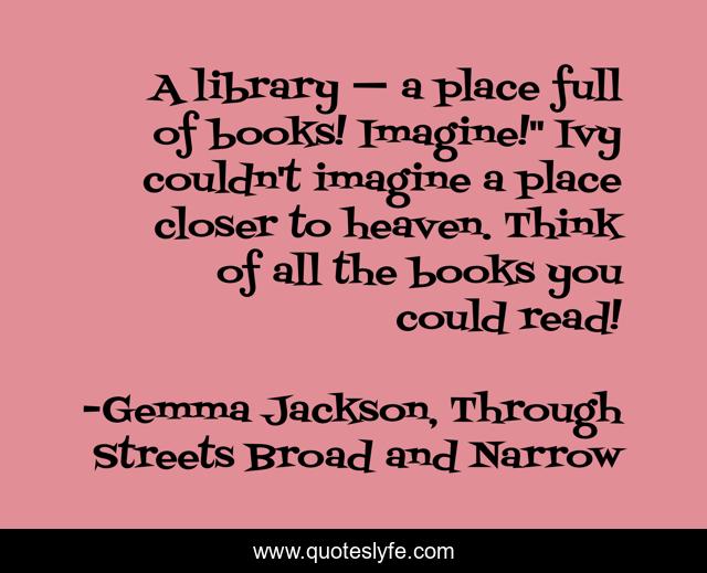 This page presents the quote "A library — a place full of books! Imagine!" Ivy couldn't imagine a place closer to heaven. Think of all the books you could read!". Author of this quote is Gemma Jackson, Through Streets Broad and Narrow. This quote is about libraries, books, heaven, reading, library,.
