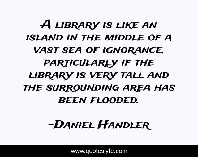 This page presents the quote "A library is like an island in the middle of a vast sea of ignorance, particularly if the library is very tall and the surrounding area has been flooded.". Author of this quote is Daniel Handler. This quote is about lemony-snicket, humor, ignorance, library,.
