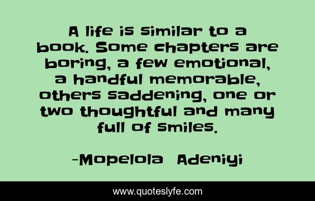 This page presents the quote "A life is similar to a book. Some chapters are boring, a few emotional, a handful memorable, others saddening, one or two thoughtful and many full of smiles.". Author of this quote is Mopelola Adeniyi. This quote is about humorous, life-and-living, inspiration,.