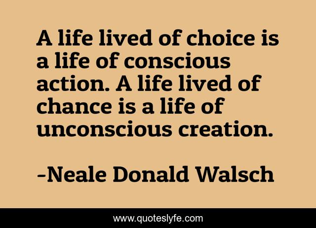 This page presents the quote "A life lived of choice is a life of conscious action. A life lived of chance is a life of unconscious creation.". Author of this quote is Neale Donald Walsch. This quote is about action, life, choice,.