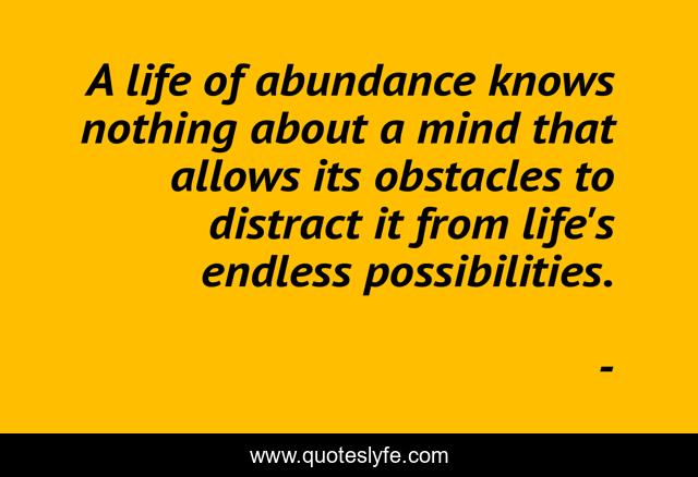 This page presents the quote "A life of abundance knows nothing about a mind that allows its obstacles to distract it from life's endless possibilities.". Author of this quote is . This quote is about a-life-of-abundance, endless-possibilities-in-life, edmond-mbiaka, obstacles, mind, life-s-endless-possibilities, obstacle,.