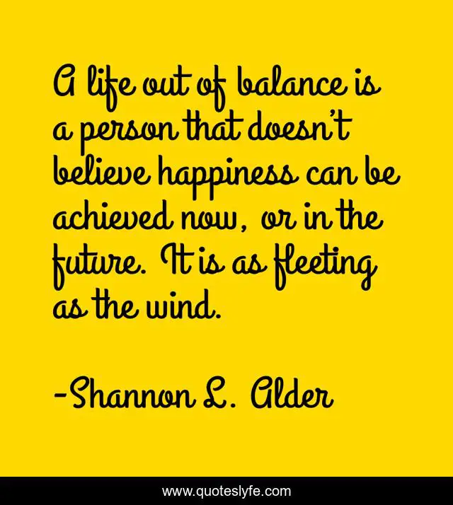 This page presents the quote "A life out of balance is a person that doesn’t believe happiness can be achieved now, or in the future. It is as fleeting as the wind.". Author of this quote is Shannon L. Alder. This quote is about self-respect, self-defeat, attitude, anger, happiness, balanced-life, spiritual-balance, mental-disorders, issues,.