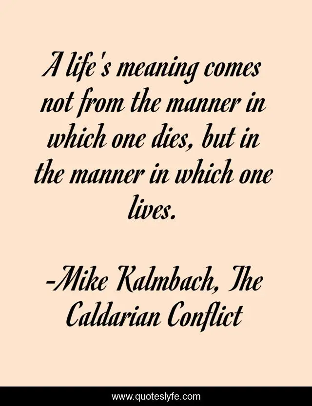 This page presents the quote "A life's meaning comes not from the manner in which one dies, but in the manner in which one lives.". Author of this quote is Mike Kalmbach, The Caldarian Conflict. This quote is about living, life-s-meaning, dying,.