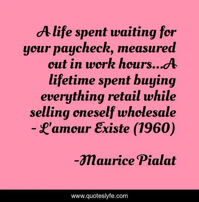 "Maurice Pialat Quotes." Quoteslyfe.com, 2025. Fri. 05 Dec. 2025. <https://www.quoteslyfe.com/quote/A-life-spent-waiting-for-your-paycheck-244005>.