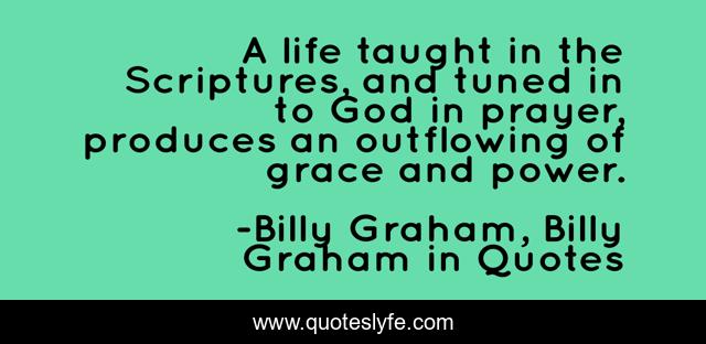 This page presents the quote "A life taught in the Scriptures, and tuned in to God in prayer, produces an outflowing of grace and power.". Author of this quote is Billy Graham, Billy Graham in Quotes. This quote is about billy-graham, prayer,.