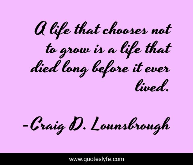 This page presents the quote "A life that chooses not to grow is a life that died long before it ever lived.". Author of this quote is Craig D. Lounsbrough. This quote is about life, abandoned, lost, comfort, familiarity, chooses, fear, grow, died,.
