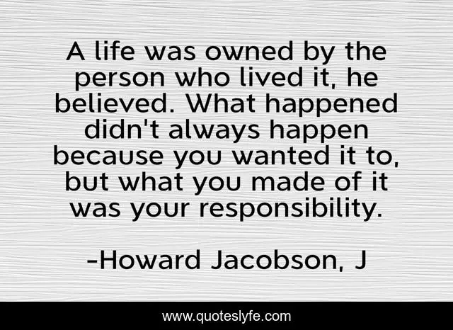 This page presents the quote "A life was owned by the person who lived it, he believed. What happened didn't always happen because you wanted it to, but what you made of it was your responsibility.". Author of this quote is Howard Jacobson, J. This quote is about life, responsibility,.