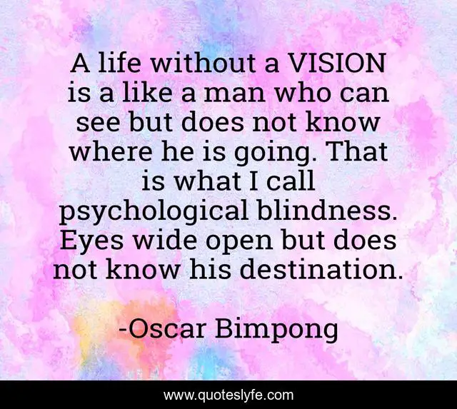 This page presents the quote "A life without a VISION is a like a man who can see but does not know where he is going. That is what I call psychological blindness. Eyes wide open but does not know his destination.". Author of this quote is Oscar Bimpong. This quote is about eyes-open, destination, life, see, psychological-blindness, vision,.