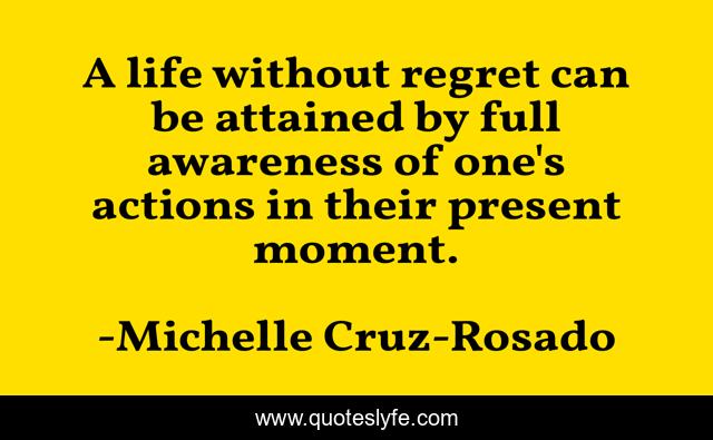 This page presents the quote "A life without regret can be attained by full awareness of one's actions in their present moment.". Author of this quote is Michelle Cruz-Rosado. This quote is about confidence, self-awareness, self-control, positive, motivational, optimistic, inspirational, enthusiasm, live-in-the-moment,.