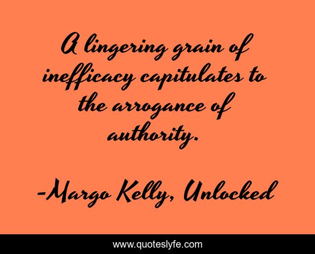 This page presents the quote "A lingering grain of inefficacy capitulates to the arrogance of authority.". Author of this quote is Margo Kelly, Unlocked. This quote is about arrogance, authority, wisdom,.