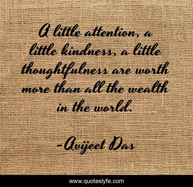 This page presents the quote "A little attention, a little kindness, a little thoughtfulness are worth more than all the wealth in the world.". Author of this quote is Avijeet Das. This quote is about artiste, attention, writer, lifelife-lessons, kindness, thoughtfulness,.