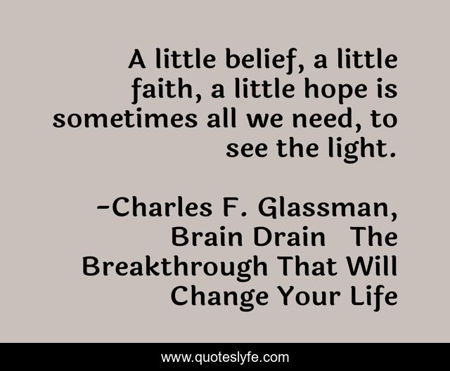 This page presents the quote "A little belief, a little faith, a little hope is sometimes all we need, to see the light.". Author of this quote is Charles F. Glassman, Brain Drain The Breakthrough That Will Change Your Life. This quote is about faith, hope, belief, inspirational, enthusiasm,.