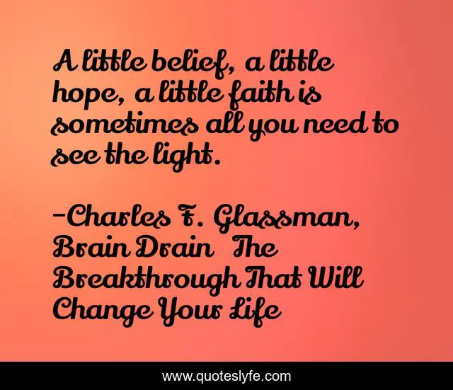 This page presents the quote "A little belief, a little hope, a little faith is sometimes all you need to see the light.". Author of this quote is Charles F. Glassman, Brain Drain The Breakthrough That Will Change Your Life. This quote is about faith, belief, hope,.