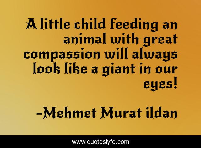 This page presents the quote "A little child feeding an animal with great compassion will always look like a giant in our eyes!". Author of this quote is Mehmet Murat ildan. This quote is about turkish-aphorisms, giant, mehmet-murat-ildan, ildan-wise-sayings, turkish, compassion, turkish-sayings, turkish-playwrights, turkish-thinkers,.