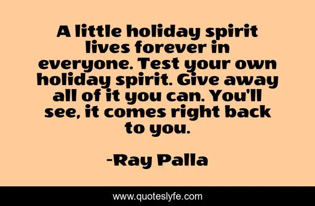 This page presents the quote "A little holiday spirit lives forever in everyone. Test your own holiday spirit. Give away all of it you can. You'll see, it comes right back to you.". Author of this quote is Ray Palla. This quote is about believer-test, give-away, belief, true-believer, forever, holilday-spirit, come-back, believe,.