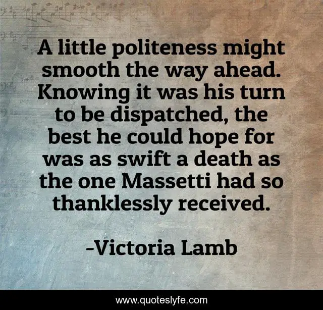 This page presents the quote "A little politeness might smooth the way ahead. Knowing it was his turn to be dispatched, the best he could hope for was as swift a death as the one Massetti had so thanklessly received.". Author of this quote is Victoria Lamb. This quote is about goodluck, assassination, death, thriller, the-queen-s-secret,.