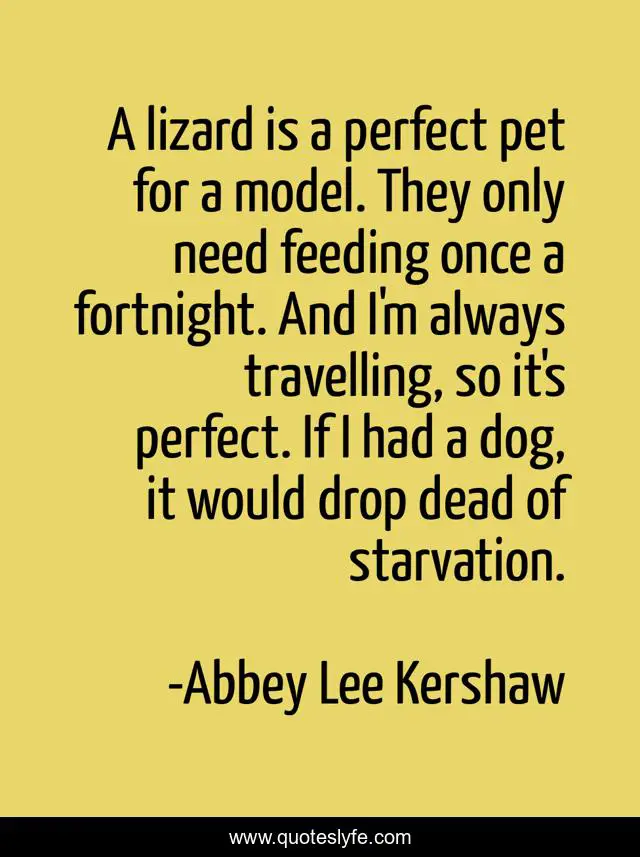 This page presents the quote "A lizard is a perfect pet for a model. They only need feeding once a fortnight. And I'm always travelling, so it's perfect. If I had a dog, it would drop dead of starvation.". Author of this quote is Abbey Lee Kershaw. This quote is about perfect, need, dog,.