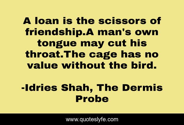 This page presents the quote "A loan is the scissors of friendship.A man's own tongue may cut his throat.The cage has no value without the bird.". Author of this quote is Idries Shah, The Dermis Probe. This quote is about knowledge, sufism, saadi, proverb, sufis, friendship,.