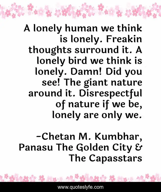 This page presents the quote "A lonely human we think is lonely. Freakin thoughts surround it. A lonely bird we think is lonely. Damn! Did you see! The giant nature around it. Disrespectful of nature if we be, lonely are only we.". Author of this quote is Chetan M. Kumbhar, Panasu The Golden City & The Capasstars. This quote is about giant, love, prosperous, nature, freedom, world, unlimited, universe, respect,.