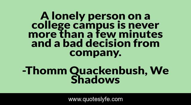 This page presents the quote "A lonely person on a college campus is never more than a few minutes and a bad decision from company.". Author of this quote is Thomm Quackenbush, We Shadows. This quote is about lonely, college, bad-decisions,.
