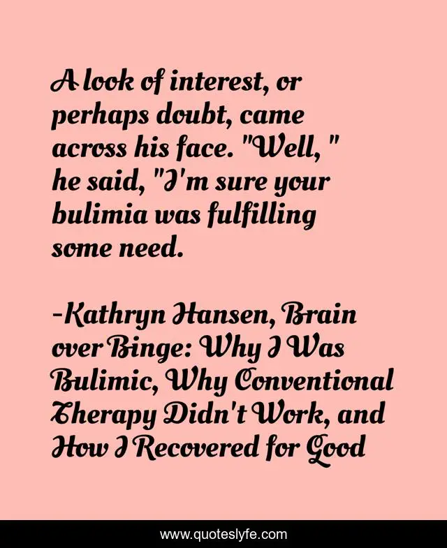 This page presents the quote "A look of interest, or perhaps doubt, came across his face. "Well, " he said, "I'm sure your bulimia was fulfilling some need.". Author of this quote is Kathryn Hansen, Brain over Binge: Why I Was Bulimic, Why Conventional Therapy Didn't Work, and How I Recovered for Good. This quote is about eating-disorder, need, eating-disorders,.
